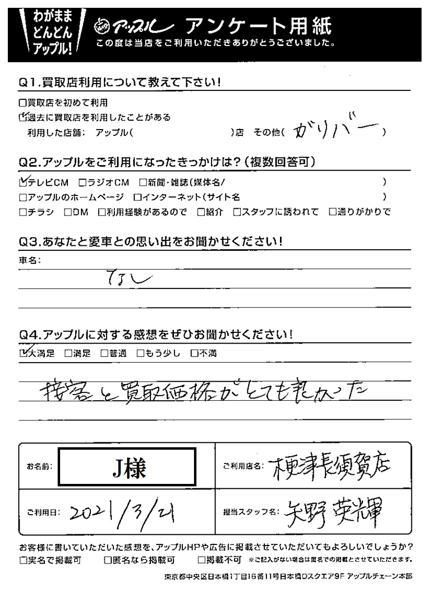 お車のご相談・ 査定だけでもOK! カンタン 入力 30秒 アップルがブランド買取始めました! お電話でも受付中! 受付時間10:00 ~ 18:00最終受付 0438-23-1231 お車のご相談・ 査定だけでもOK! カンタン 入力 30秒 アップルがブランド買取始めました! お電話でも受付中! 受付時間10:00 ~ 18:00最終受付 0438-23-1231 アップルがブランド買取始めました! お電話でも受付中! 受付時間10:00 ~ 18:00最終受付 0438-23-1231 店舗情報 在庫車 スタッフ紹介 ブログ お客様の声 キャンペーン お得 無料査定 click お客様の声 ご記入日: 2021/03/21 J様 Q アップルに対する感想をぜひお聞かせください!感想:大満足接客と買取価格がとても良かった 前へ 次へ お客様の声一覧を見る