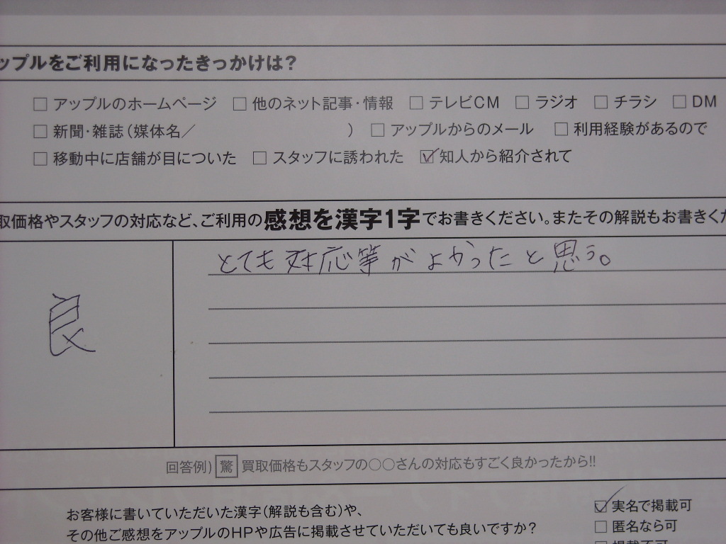 お車のご相談・ 査定だけでもOK! カンタン 入力 30秒 アップルがブランド買取始めました! お電話でも受付中! 受付時間10:00 ~ 18:00最終受付 0438-23-1231 お車のご相談・ 査定だけでもOK! カンタン 入力 30秒 アップルがブランド買取始めました! お電話でも受付中! 受付時間10:00 ~ 18:00最終受付 0438-23-1231 アップルがブランド買取始めました! お電話でも受付中! 受付時間10:00 ~ 18:00最終受付 0438-23-1231 店舗情報 在庫車 スタッフ紹介 ブログ お客様の声 キャンペーン お得 無料査定 click お客様の声 ご記入日: 2009/09/25 色部 尚子様 とても対応等がよかったと思う。 前へ 次へ お客様の声一覧を見る