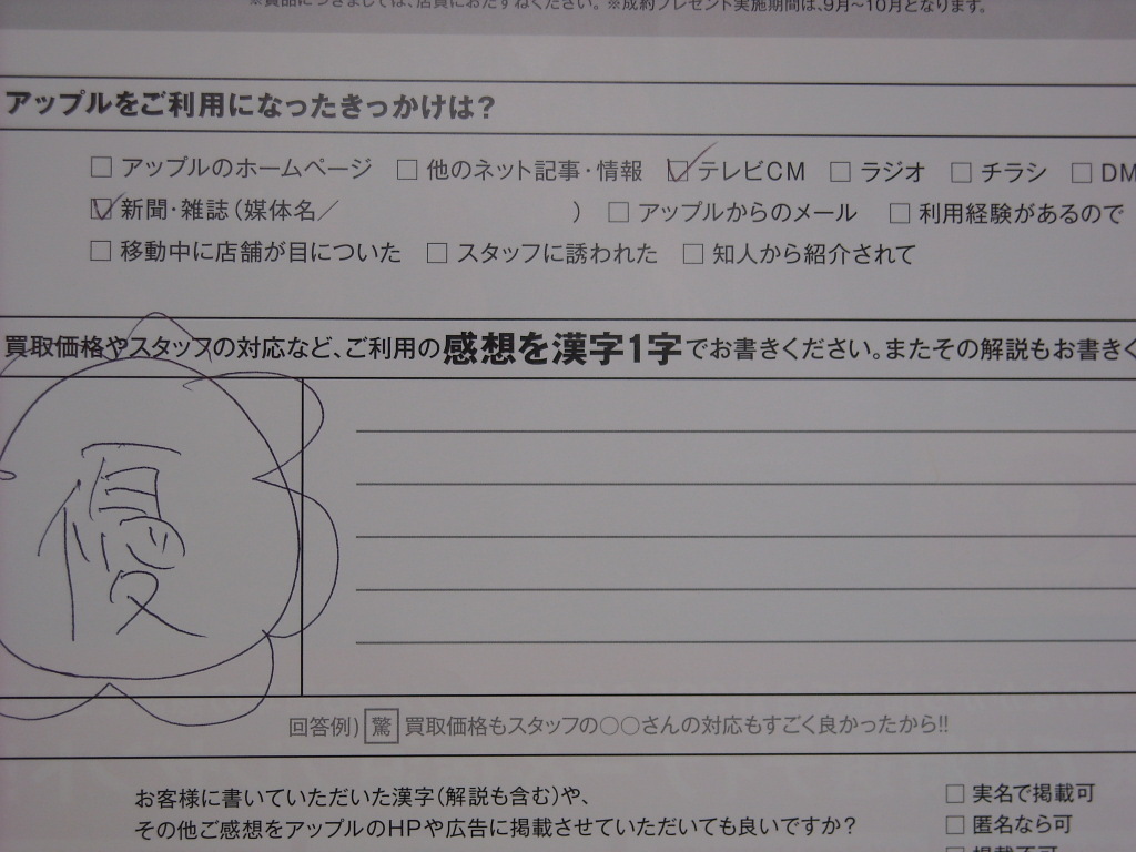 お車のご相談・ 査定だけでもOK! カンタン 入力 30秒 アップルがブランド買取始めました! お電話でも受付中! 受付時間10:00 ~ 18:00最終受付 0438-23-1231 お車のご相談・ 査定だけでもOK! カンタン 入力 30秒 アップルがブランド買取始めました! お電話でも受付中! 受付時間10:00 ~ 18:00最終受付 0438-23-1231 アップルがブランド買取始めました! お電話でも受付中! 受付時間10:00 ~ 18:00最終受付 0438-23-1231 店舗情報 在庫車 スタッフ紹介 ブログ お客様の声 キャンペーン お得 無料査定 click お客様の声 ご記入日: 2009/09/29 T.M様 店舗補足説明***ご感想を漢字一字でということで、 ハナマル優をいただきました!!!*** 前へ 次へ お客様の声一覧を見る