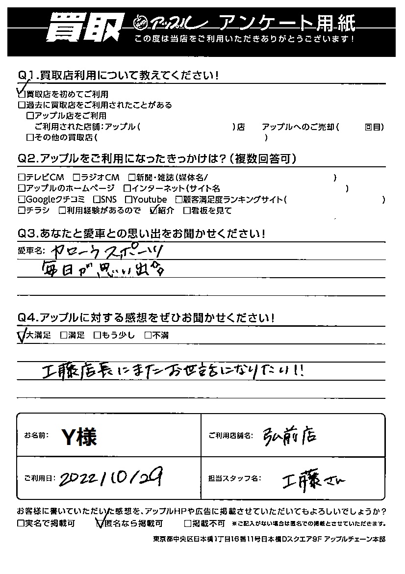 スーパーアップル弘前店 お車のご相談・ 査定だけでもOK! カンタン 入力 30秒 アップルがブランド買取始めました! お電話でも受付中! 受付時間9:30~18:00 0120-922-585 お車のご相談・ 査定だけでもOK! カンタン 入力 30秒 アップルがブランド買取始めました! お電話でも受付中! 受付時間9:30~18:00 0120-922-585 アップルがブランド買取始めました! お電話でも受付中! 受付時間9:30~18:00 0120-922-585 店舗情報 在庫車 スタッフ紹介 ブログ お客様の声 キャンペーン 無料査定 click お客様の声 ご記入日: 2022/10/29 Y様 車名:トヨタ カローラスポーツ Q:あなたと愛車との思い出をぜひお聞かせください!愛車名:カローラスポーツ毎日が思い出★Q:アップルに対する感想をぜひお聞かせください!大満足工藤店長にまたお世話になりたい!! 前へ 次へ お客様の声一覧を見る