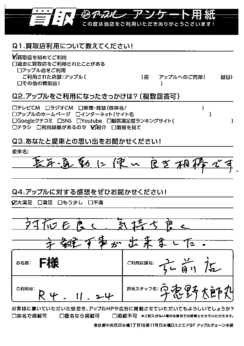 スーパーアップル弘前店 お車のご相談・ 査定だけでもOK! カンタン 入力 30秒 アップルがブランド買取始めました! お電話でも受付中! 受付時間9:30~18:00 0120-922-585 お車のご相談・ 査定だけでもOK! カンタン 入力 30秒 アップルがブランド買取始めました! お電話でも受付中! 受付時間9:30~18:00 0120-922-585 アップルがブランド買取始めました! お電話でも受付中! 受付時間9:30~18:00 0120-922-585 店舗情報 在庫車 スタッフ紹介 ブログ お客様の声 キャンペーン 無料査定 click お客様の声 ご記入日: 2022/11/24 F様 Q:あなたと愛車との思い出をお聞かせください!長年通勤に使い 良き相棒です。Q:アップルに対する感想をぜひお聞かせください!大満足対応も良く、気持ち良く手離す事が出来ました。 前へ 次へ お客様の声一覧を見る