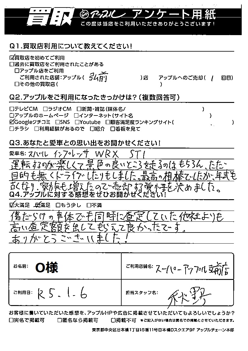 O様 車名:スバル WRX (2021年11月~のWRX S4を除く)