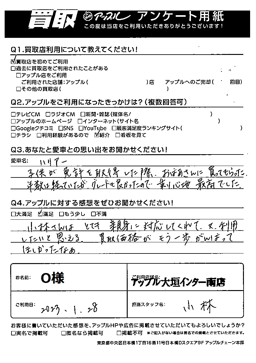 O様 車名:トヨタ ハリアー (H25年12月~のハイブリッド含む)