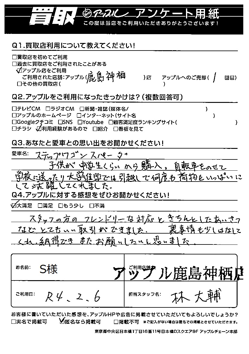とてもいい取引ができました。裏事情も少しはなしてくれ、納得でき