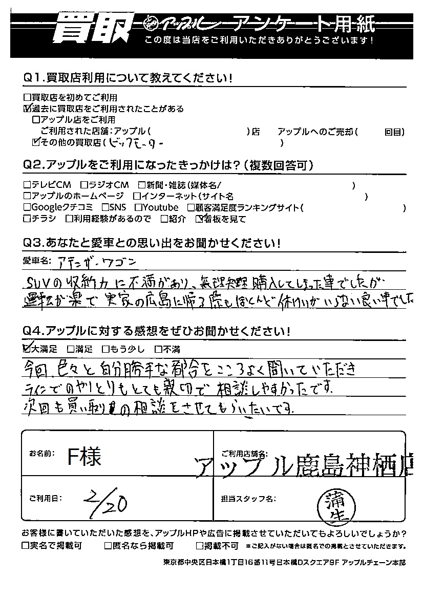 F様 車名:マツダ アテンザワゴン