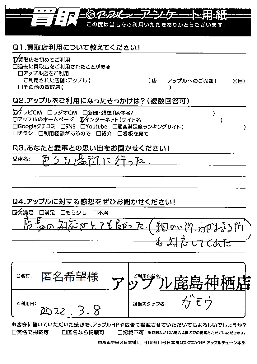 お車のご相談・ 査定だけでもOK! カンタン 入力 30秒 アップルがブランド買取始めました! お電話でも受付中! 受付時間10:00 ~ 18:00 0120-20-3805 お車のご相談・ 査定だけでもOK! カンタン 入力 30秒 アップルがブランド買取始めました! お電話でも受付中! 受付時間10:00 ~ 18:00 0120-20-3805 アップルがブランド買取始めました! お電話でも受付中! 受付時間10:00 ~ 18:00 0120-20-3805 店舗情報 在庫車 スタッフ紹介 ブログ お客様の声 キャンペーン お得 無料査定 click お客様の声 ご記入日: 2022/03/08 匿名希望様 Q あなたと愛車との思い出をお聞かせください!色々な場所に行ったQ アップルに対する感想をぜひお聞かせください!感想:大満足店長の対応がとても良かった。(細かい所、わがままな所も対応してくれた) 前へ 次へ お客様の声一覧を見る
