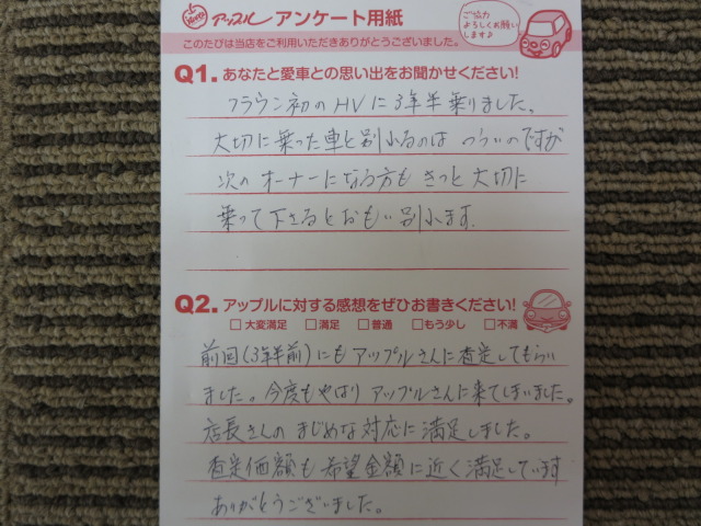 クラウン初のHVに3年半乗りました。大切に乗った車と別れるのはつらいのですが、次のオーナーになる方もきっと大切に乗って下さると思い、別れます。