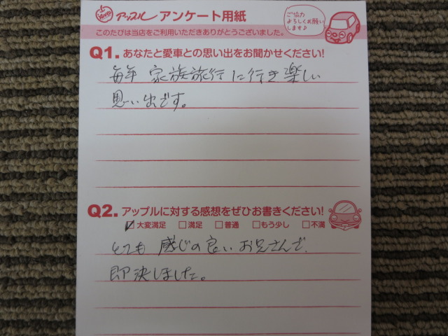 お車のご相談・ 査定だけでもOK! カンタン 入力 30秒 アップルがブランド買取始めました! お電話でも受付中! 受付時間9:30 ~ 18:30 0561-38-8448 お車のご相談・ 査定だけでもOK! カンタン 入力 30秒 アップルがブランド買取始めました! お電話でも受付中! 受付時間9:30 ~ 18:30 0561-38-8448 アップルがブランド買取始めました! お電話でも受付中! 受付時間9:30 ~ 18:30 0561-38-8448 店舗情報 在庫車 スタッフ紹介 ブログ お客様の声 キャンペーン 無料査定 click お客様の声 ご記入日: 2013/03/03 匿名希望様 【愛車との思い出】毎年、家族旅行に行き楽しい思い出です。【アップルに対する感想】とても感じの良いお兄さんで即決しました。 前へ 次へ お客様の声一覧を見る