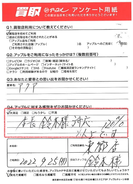 お車のご相談・ 査定だけでもOK! カンタン 入力 30秒 アップルがブランド買取始めました! お電話でも受付中! 受付時間9:30 ~ 18:30 0561-38-8448 お車のご相談・ 査定だけでもOK! カンタン 入力 30秒 アップルがブランド買取始めました! お電話でも受付中! 受付時間9:30 ~ 18:30 0561-38-8448 アップルがブランド買取始めました! お電話でも受付中! 受付時間9:30 ~ 18:30 0561-38-8448 店舗情報 在庫車 スタッフ紹介 ブログ お客様の声 キャンペーン 無料査定 click お客様の声 ご記入日: 2022/09/25 S様 車名:トヨタ アクア 満足度★★★★★店長 鈴木様対応、120%以上です。 前へ 次へ お客様の声一覧を見る