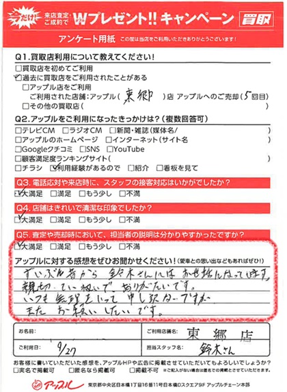 お車のご相談・ 査定だけでもOK! カンタン 入力 30秒 アップルがブランド買取始めました! お電話でも受付中! 受付時間9:30 ~ 18:30 0561-38-8448 お車のご相談・ 査定だけでもOK! カンタン 入力 30秒 アップルがブランド買取始めました! お電話でも受付中! 受付時間9:30 ~ 18:30 0561-38-8448 アップルがブランド買取始めました! お電話でも受付中! 受付時間9:30 ~ 18:30 0561-38-8448 店舗情報 在庫車 スタッフ紹介 ブログ お客様の声 キャンペーン 無料査定 click お客様の声 ご記入日: 2023/09/27 M様 車名:スズキ アルトラパン ラパン(アルト) 満足度★★★★★ずいぶん昔から鈴木さんにはお世話になっています。親切・ていねいでありがたいです。いつも無理を言って申し訳ないですが、またお願いしたいです。 前へ 次へ お客様の声一覧を見る