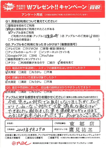 今回、急きょの対応での取引となりましたが、スムーズかつ丁寧なご対応で大変満足な取引ができました。