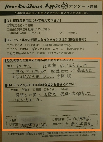 お車のご相談・ 査定だけでもOK! カンタン 入力 30秒 アップルがブランド買取始めました! お電話でも受付中! 受付時間9:30 ~ 18:30 0561-38-8448 お車のご相談・ 査定だけでもOK! カンタン 入力 30秒 アップルがブランド買取始めました! お電話でも受付中! 受付時間9:30 ~ 18:30 0561-38-8448 アップルがブランド買取始めました! お電話でも受付中! 受付時間9:30 ~ 18:30 0561-38-8448 店舗情報 在庫車 スタッフ紹介 ブログ お客様の声 キャンペーン 無料査定 click お客様の声 ご記入日: 2015/02/16 A様 ■ご利用日時■ H27 年2月16日■車種■ 鈴木店長■担当者■ 【アップルに対する感想をぜひお書きください】満足度★★★★気持ちの良いお店で 気持ち良く応対していただきました。 前へ 次へ お客様の声一覧を見る