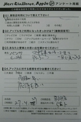お車のご相談・ 査定だけでもOK! カンタン 入力 30秒 アップルがブランド買取始めました! お電話でも受付中! 受付時間9:30 ~ 18:30 0561-38-8448 お車のご相談・ 査定だけでもOK! カンタン 入力 30秒 アップルがブランド買取始めました! お電話でも受付中! 受付時間9:30 ~ 18:30 0561-38-8448 アップルがブランド買取始めました! お電話でも受付中! 受付時間9:30 ~ 18:30 0561-38-8448 店舗情報 在庫車 スタッフ紹介 ブログ お客様の声 キャンペーン 無料査定 click お客様の声 ご記入日: 2015/04/29 匿名希望様 ■ご利用日時■ H27年4月29日■車種■ ベンツC■担当者■ 佐藤【アップルに対する感想をぜひお書きください】満足度★★★★商談が早い。応対も良い。 前へ 次へ お客様の声一覧を見る