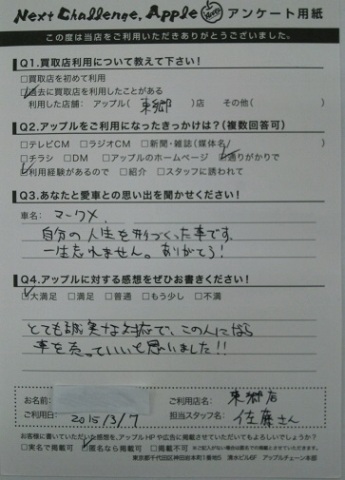 お車のご相談・ 査定だけでもOK! カンタン 入力 30秒 アップルがブランド買取始めました! お電話でも受付中! 受付時間9:30 ~ 18:30 0561-38-8448 お車のご相談・ 査定だけでもOK! カンタン 入力 30秒 アップルがブランド買取始めました! お電話でも受付中! 受付時間9:30 ~ 18:30 0561-38-8448 アップルがブランド買取始めました! お電話でも受付中! 受付時間9:30 ~ 18:30 0561-38-8448 店舗情報 在庫車 スタッフ紹介 ブログ お客様の声 キャンペーン 無料査定 click お客様の声 ご記入日: 2015/03/07 T・T様 ■ご利用日時■ H27年3月7日■車種■ マークX■担当者■ 佐藤【アップルに対する感想をぜひお書きください】満足度★★★★★とても誠実な対応で この人になら車を売っていいと思いました。 前へ 次へ お客様の声一覧を見る
