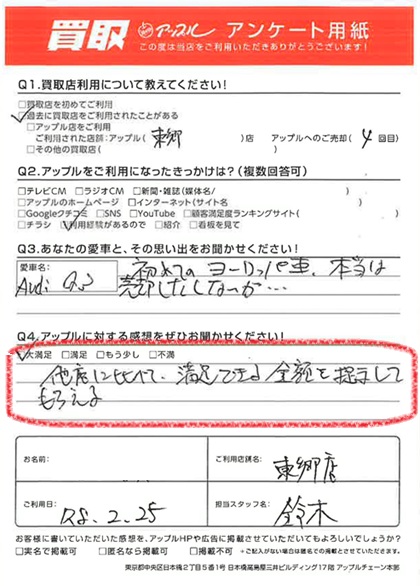 お車のご相談・ 査定だけでもOK! カンタン 入力 30秒 アップルがブランド買取始めました! お電話でも受付中! 受付時間9:30 ~ 18:30 0561-38-8448 お車のご相談・ 査定だけでもOK! カンタン 入力 30秒 アップルがブランド買取始めました! お電話でも受付中! 受付時間9:30 ~ 18:30 0561-38-8448 アップルがブランド買取始めました! お電話でも受付中! 受付時間9:30 ~ 18:30 0561-38-8448 店舗情報 在庫車 スタッフ紹介 ブログ お客様の声 キャンペーン 無料査定 click お客様の声 ご記入日: 2026/02/25 K様 車名:アウディ Q3 満足度★★★★★他店に比べて、満足できる金額を提示してもらえる 前へ 次へ お客様の声一覧を見る