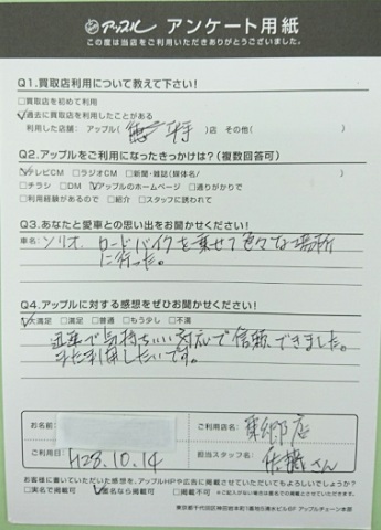 お車のご相談・ 査定だけでもOK! カンタン 入力 30秒 アップルがブランド買取始めました! お電話でも受付中! 受付時間9:30 ~ 18:30 0561-38-8448 お車のご相談・ 査定だけでもOK! カンタン 入力 30秒 アップルがブランド買取始めました! お電話でも受付中! 受付時間9:30 ~ 18:30 0561-38-8448 アップルがブランド買取始めました! お電話でも受付中! 受付時間9:30 ~ 18:30 0561-38-8448 店舗情報 在庫車 スタッフ紹介 ブログ お客様の声 キャンペーン 無料査定 click お客様の声 ご記入日: 2016/10/14 H.K様 ■ご利用日時■ H28年10月14日■車種■ ソリオ■担当者■ 佐藤【アップルに対する感想をぜひお書きください】満足度★★★★★迅速で気持ちいい対応で信頼できましたまた利用したいです 前へ 次へ お客様の声一覧を見る