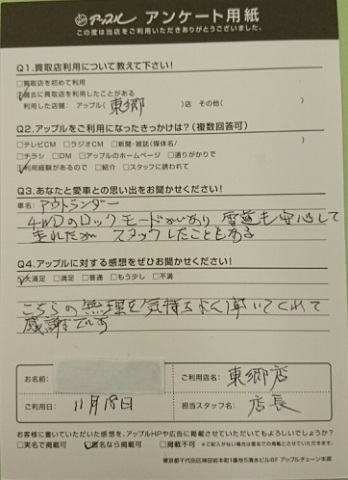 お車のご相談・ 査定だけでもOK! カンタン 入力 30秒 アップルがブランド買取始めました! お電話でも受付中! 受付時間9:30 ~ 18:30 0561-38-8448 お車のご相談・ 査定だけでもOK! カンタン 入力 30秒 アップルがブランド買取始めました! お電話でも受付中! 受付時間9:30 ~ 18:30 0561-38-8448 アップルがブランド買取始めました! お電話でも受付中! 受付時間9:30 ~ 18:30 0561-38-8448 店舗情報 在庫車 スタッフ紹介 ブログ お客様の声 キャンペーン 無料査定 click お客様の声 ご記入日: 2016/11/18 T・K様 ■ご利用日時■ H28年11月18日■車種■ アウトランダー■担当者■ 鈴木店長【アップルに対する感想をぜひお書きください】満足度★★★★★こちらの無理を気持ちよく聞いてくれて感謝です 前へ 次へ お客様の声一覧を見る