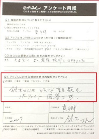 お車のご相談・ 査定だけでもOK! カンタン 入力 30秒 アップルがブランド買取始めました! お電話でも受付中! 受付時間9:30 ~ 18:30 0561-38-8448 お車のご相談・ 査定だけでもOK! カンタン 入力 30秒 アップルがブランド買取始めました! お電話でも受付中! 受付時間9:30 ~ 18:30 0561-38-8448 アップルがブランド買取始めました! お電話でも受付中! 受付時間9:30 ~ 18:30 0561-38-8448 店舗情報 在庫車 スタッフ紹介 ブログ お客様の声 キャンペーン 無料査定 click お客様の声 ご記入日: 2017/08/02 K.Y様 ■ご利用日時■ H 29 年 8 月 2 日■車種■ フーガ■担当者■ 鈴木店長《アップルに対する感想をぜひお書きください》満足度★★★★★鈴木さんはどんな難題もパーフェクト回答です。 前へ 次へ お客様の声一覧を見る