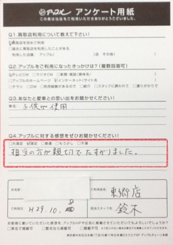 お車のご相談・ 査定だけでもOK! カンタン 入力 30秒 アップルがブランド買取始めました! お電話でも受付中! 受付時間9:30 ~ 18:30 0561-38-8448 お車のご相談・ 査定だけでもOK! カンタン 入力 30秒 アップルがブランド買取始めました! お電話でも受付中! 受付時間9:30 ~ 18:30 0561-38-8448 アップルがブランド買取始めました! お電話でも受付中! 受付時間9:30 ~ 18:30 0561-38-8448 店舗情報 在庫車 スタッフ紹介 ブログ お客様の声 キャンペーン 無料査定 click お客様の声 ご記入日: 2017/10/08 E・H様 ■ご利用日時■ H 29 年 10 月 8 日■車種■ シエンタ■担当者■ 鈴木店長《アップルに対する感想をぜひお書きください》満足度★★★★担当の方が親切でたすかりました。 前へ 次へ お客様の声一覧を見る