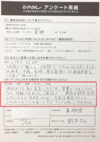 他社よりも高く査定していただき、営業トークもしつこくなく、信頼できました(前回)