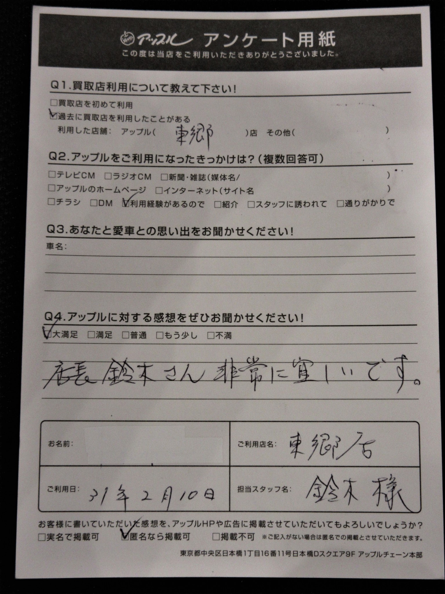 お車のご相談・ 査定だけでもOK! カンタン 入力 30秒 アップルがブランド買取始めました! お電話でも受付中! 受付時間9:30 ~ 18:30 0561-38-8448 お車のご相談・ 査定だけでもOK! カンタン 入力 30秒 アップルがブランド買取始めました! お電話でも受付中! 受付時間9:30 ~ 18:30 0561-38-8448 アップルがブランド買取始めました! お電話でも受付中! 受付時間9:30 ~ 18:30 0561-38-8448 店舗情報 在庫車 スタッフ紹介 ブログ お客様の声 キャンペーン 無料査定 click お客様の声 ご記入日: 2019/02/10 名古屋市緑区 Y・K様 車名:スズキ ソリオ 店長鈴木さん、非常に宜しいです!! 前へ 次へ お客様の声一覧を見る