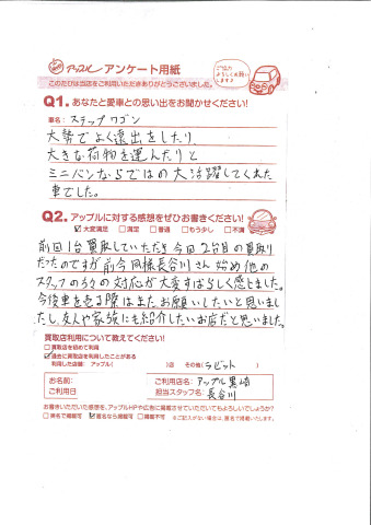 前回1台買取していただき今回2台目の買取りだったのですが、前今同様長谷川さん始め他のスタッフの方々の対応が大変すばらしく感じました。今後車を売る際は、またお願いしたいと思いましたし、友人や家族にも紹介したいお店だと思いました。