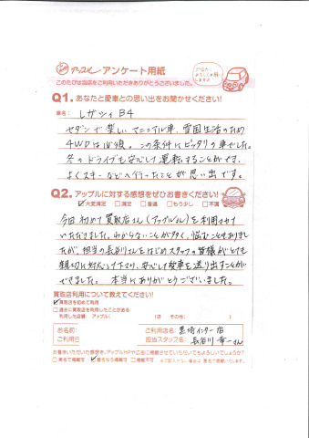 今回初めて買取店さん(アップルさん)を利用させていただきました。わからないことが多く、悩むこともありましたが、担当の長谷川さんをはじめスタッフの皆様がとても親切に対応して下さり、安心して愛車を送り出すことができました。