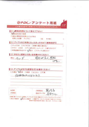 お車のご相談・ 査定だけでもOK! カンタン 入力 30秒 アップルがブランド買取始めました! お電話でも受付中! 受付時間10:00 ~ 18:30 0120-556-522 お車のご相談・ 査定だけでもOK! カンタン 入力 30秒 アップルがブランド買取始めました! お電話でも受付中! 受付時間10:00 ~ 18:30 0120-556-522 アップルがブランド買取始めました! お電話でも受付中! 受付時間10:00 ~ 18:30 0120-556-522 店舗情報 在庫車 スタッフ紹介 ブログ お客様の声 キャンペーン お得 無料査定 click お客様の声 ご記入日: 2014/04/11 I様 価格協力してもらいました。 前へ 次へ お客様の声一覧を見る