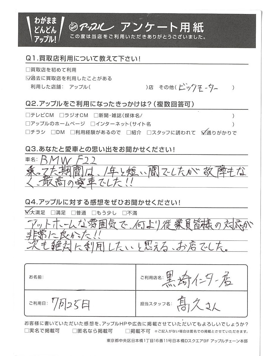 新潟県新潟市 O様 車名:BMW 2シリーズクーペ