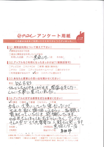 お車のご相談・ 査定だけでもOK! カンタン 入力 30秒 アップルがブランド買取始めました! お電話でも受付中! 受付時間10:00 ~ 18:30 0120-556-522 お車のご相談・ 査定だけでもOK! カンタン 入力 30秒 アップルがブランド買取始めました! お電話でも受付中! 受付時間10:00 ~ 18:30 0120-556-522 アップルがブランド買取始めました! お電話でも受付中! 受付時間10:00 ~ 18:30 0120-556-522 店舗情報 在庫車 スタッフ紹介 ブログ お客様の声 キャンペーン お得 無料査定 click お客様の声 ご記入日: 2014/09/26 Y様 スタッドレスタイヤをはかせず雪道を走らないくらい大事に乗っていました。本当に大事にしていた車だったので、それを高く評価してもらい、高額で買取っていただき感謝しています。細井さんはとてもすばらしい方でアップルさんの中でとても重要な人材だと思います。 前へ 次へ お客様の声一覧を見る