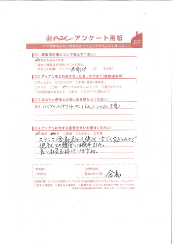 お車のご相談・ 査定だけでもOK! カンタン 入力 30秒 アップルがブランド買取始めました! お電話でも受付中! 受付時間10:00 ~ 18:30 0120-556-522 お車のご相談・ 査定だけでもOK! カンタン 入力 30秒 アップルがブランド買取始めました! お電話でも受付中! 受付時間10:00 ~ 18:30 0120-556-522 アップルがブランド買取始めました! お電話でも受付中! 受付時間10:00 ~ 18:30 0120-556-522 店舗情報 在庫車 スタッフ紹介 ブログ お客様の声 キャンペーン お得 無料査定 click お客様の声 ご記入日: 2014/10/17 U様 スタッフ(倉島君)の人柄がすごく良かったので、他社との競合は避けました。良い社員を持っていますね。 前へ 次へ お客様の声一覧を見る