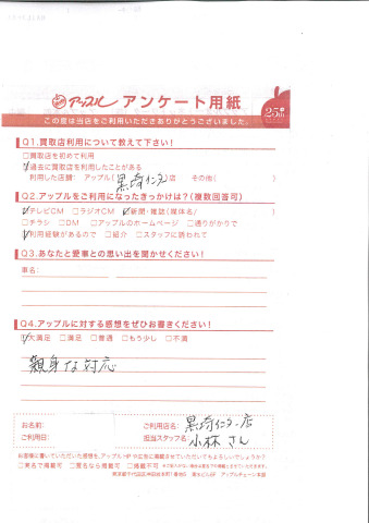 お車のご相談・ 査定だけでもOK! カンタン 入力 30秒 アップルがブランド買取始めました! お電話でも受付中! 受付時間10:00 ~ 18:30 0120-556-522 お車のご相談・ 査定だけでもOK! カンタン 入力 30秒 アップルがブランド買取始めました! お電話でも受付中! 受付時間10:00 ~ 18:30 0120-556-522 アップルがブランド買取始めました! お電話でも受付中! 受付時間10:00 ~ 18:30 0120-556-522 店舗情報 在庫車 スタッフ紹介 ブログ お客様の声 キャンペーン お得 無料査定 click お客様の声 ご記入日: 2014/10/26 T様 親身な対応 前へ 次へ お客様の声一覧を見る