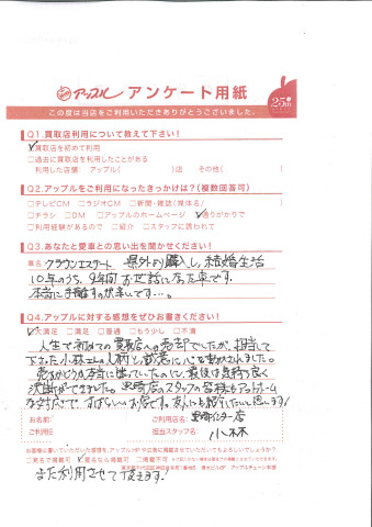 人生で初めての買取店への売却でしたが、担当して下さった小林さんの人柄と誠意に心を動かされました。