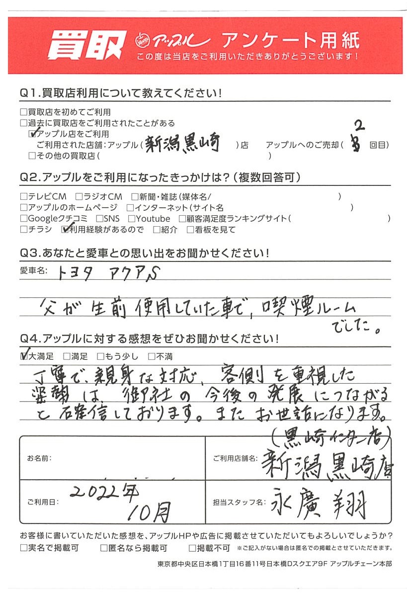 お車のご相談・ 査定だけでもOK! カンタン 入力 30秒 アップルがブランド買取始めました! お電話でも受付中! 受付時間10:00 ~ 18:30 0120-556-522 お車のご相談・ 査定だけでもOK! カンタン 入力 30秒 アップルがブランド買取始めました! お電話でも受付中! 受付時間10:00 ~ 18:30 0120-556-522 アップルがブランド買取始めました! お電話でも受付中! 受付時間10:00 ~ 18:30 0120-556-522 店舗情報 在庫車 スタッフ紹介 ブログ お客様の声 キャンペーン お得 無料査定 click お客様の声 ご記入日: 2022/10/01 H様 車名:トヨタ アクア Q3.あなたと愛車との思い出をお聞かせください!トヨタ アクア S父が生前使用していた車で、喫煙ルームでした。Q4.アップルに対する感想をぜひお聞かせください!丁寧で、親身な対応、客側を重視した姿勢は御社の今後の発展につながると確信しています。またお世話になります。 前へ 次へ お客様の声一覧を見る