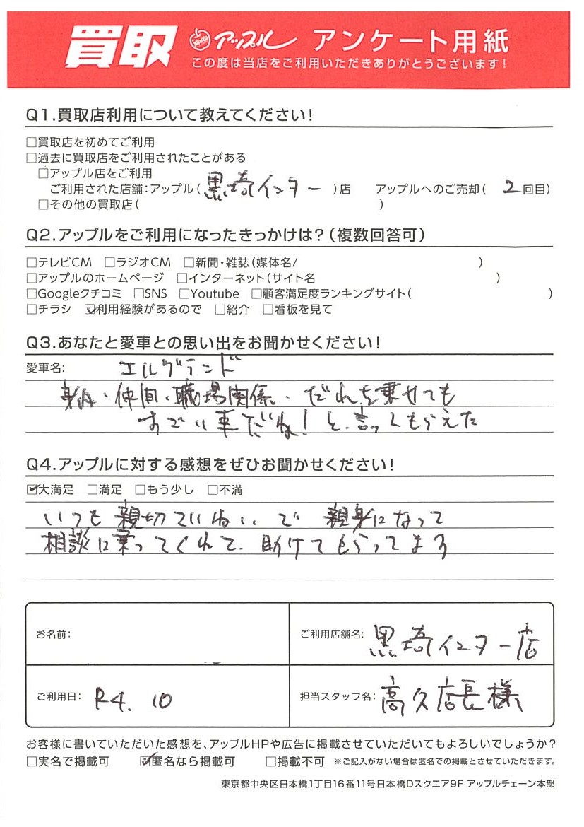 お車のご相談・ 査定だけでもOK! カンタン 入力 30秒 アップルがブランド買取始めました! お電話でも受付中! 受付時間10:00 ~ 18:30 0120-556-522 お車のご相談・ 査定だけでもOK! カンタン 入力 30秒 アップルがブランド買取始めました! お電話でも受付中! 受付時間10:00 ~ 18:30 0120-556-522 アップルがブランド買取始めました! お電話でも受付中! 受付時間10:00 ~ 18:30 0120-556-522 店舗情報 在庫車 スタッフ紹介 ブログ お客様の声 キャンペーン お得 無料査定 click お客様の声 ご記入日: 2022/10/01 T様 車名:日産 エルグランド Q3.あなたと愛車との思い出をお聞かせください!エルグランド身内・仲間・職場関係・誰を乗せてもすごい車だね!と言ってもらえたQ4.アップルに対する感想をぜひお聞かせください!いつも親切ていねいで親身になって相談に乗ってくれて、助けてもらってます。 前へ 次へ お客様の声一覧を見る