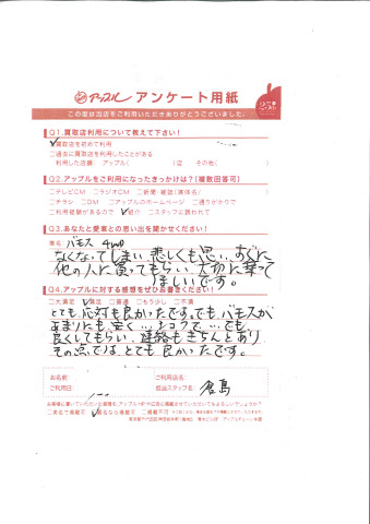 お車のご相談・ 査定だけでもOK! カンタン 入力 30秒 アップルがブランド買取始めました! お電話でも受付中! 受付時間10:00 ~ 18:30 0120-556-522 お車のご相談・ 査定だけでもOK! カンタン 入力 30秒 アップルがブランド買取始めました! お電話でも受付中! 受付時間10:00 ~ 18:30 0120-556-522 アップルがブランド買取始めました! お電話でも受付中! 受付時間10:00 ~ 18:30 0120-556-522 店舗情報 在庫車 スタッフ紹介 ブログ お客様の声 キャンペーン お得 無料査定 click お客様の声 ご記入日: 2014/12/05 N様 なくなってしまい悲しくも思い、すぐに他の人に買ってもらい大切に乗ってほしいです。とても応対も良かったです。でもバモスがあまりにも安く・・・ショックで・・・でも良くしてもらい、連絡もきちんとあり、その点では、とても良かったです。 前へ 次へ お客様の声一覧を見る