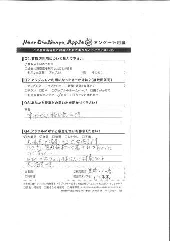お車のご相談・ 査定だけでもOK! カンタン 入力 30秒 アップルがブランド買取始めました! お電話でも受付中! 受付時間10:00 ~ 18:30 0120-556-522 お車のご相談・ 査定だけでもOK! カンタン 入力 30秒 アップルがブランド買取始めました! お電話でも受付中! 受付時間10:00 ~ 18:30 0120-556-522 アップルがブランド買取始めました! お電話でも受付中! 受付時間10:00 ~ 18:30 0120-556-522 店舗情報 在庫車 スタッフ紹介 ブログ お客様の声 キャンペーン お得 無料査定 click お客様の声 ご記入日: 2015/03/27 N様 大満足+満足÷2で中満足です。もう少し買取価格が高ければ良かったのですが・・・ただスタッフの小林さんの対応には大満足です。 前へ 次へ お客様の声一覧を見る