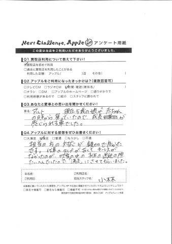 お車のご相談・ 査定だけでもOK! カンタン 入力 30秒 アップルがブランド買取始めました! お電話でも受付中! 受付時間10:00 ~ 18:30 0120-556-522 お車のご相談・ 査定だけでもOK! カンタン 入力 30秒 アップルがブランド買取始めました! お電話でも受付中! 受付時間10:00 ~ 18:30 0120-556-522 アップルがブランド買取始めました! お電話でも受付中! 受付時間10:00 ~ 18:30 0120-556-522 店舗情報 在庫車 スタッフ紹介 ブログ お客様の声 キャンペーン お得 無料査定 click お客様の声 ご記入日: 2015/04/10 K様 現在5歳の娘が赤ちゃんの時から乗っていたので成長が感じられる車でした。担当の方の対応が親切で良かったです。代車のタイプが古くてキーレスがなかったのですが吹雪の中の子供の送迎の際たいへんでしたので『満足』にさせてもらいました。 前へ 次へ お客様の声一覧を見る