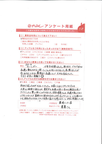 初めて伺ったのがH26.11でした。お店に入るとスタッフの方々の元気な挨拶で迎えられ査定中も私達の話に合わせ雑誌を持ってきて下さったり楽しく待つことができました。担当の倉島さんは私達が車を大切にしてきたことくんで“最後大切に送り出せるようにします”と言って下さったこと、とても嬉しかったです。もちろんスタッフ全員の温かさを感じれたこと、本当に感謝しています。