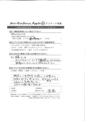お車のご相談・ 査定だけでもOK! カンタン 入力 30秒 アップルがブランド買取始めました! お電話でも受付中! 受付時間10:00 ~ 18:30 0120-556-522 お車のご相談・ 査定だけでもOK! カンタン 入力 30秒 アップルがブランド買取始めました! お電話でも受付中! 受付時間10:00 ~ 18:30 0120-556-522 アップルがブランド買取始めました! お電話でも受付中! 受付時間10:00 ~ 18:30 0120-556-522 店舗情報 在庫車 スタッフ紹介 ブログ お客様の声 キャンペーン お得 無料査定 click お客様の声 ご記入日: 2015/09/06 A様 誠意を一生懸命な感じで印象よく信頼できるなと思いました。他のスタッフの方もさわやかで気持ち良かった。ステキな職場ですね♪ 前へ 次へ お客様の声一覧を見る