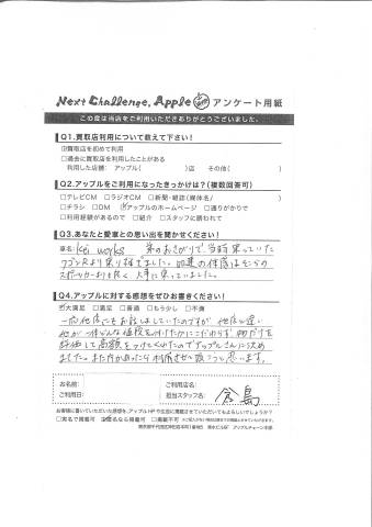 一応、他店にもお話はしていたのですが、他店と違い他が一体どんな値段をつけたかにこだわらず、物だけを評価して高額をつけてくれたのでアップルさんに決めました。また何かあったら利用させて頂こうと思います。