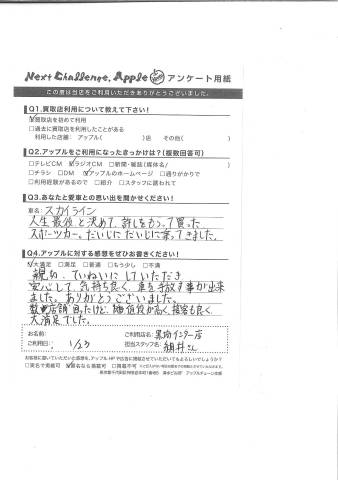 お車のご相談・ 査定だけでもOK! カンタン 入力 30秒 アップルがブランド買取始めました! お電話でも受付中! 受付時間10:00 ~ 18:30 0120-556-522 お車のご相談・ 査定だけでもOK! カンタン 入力 30秒 アップルがブランド買取始めました! お電話でも受付中! 受付時間10:00 ~ 18:30 0120-556-522 アップルがブランド買取始めました! お電話でも受付中! 受付時間10:00 ~ 18:30 0120-556-522 店舗情報 在庫車 スタッフ紹介 ブログ お客様の声 キャンペーン お得 無料査定 click お客様の声 ご記入日: 2016/01/23 I様 新設、丁寧にしていただき安心して気持ちよく車を手放すことができました。ありがとうございました。数店舗回ったけど、1番値段が高く、接客もよく大満足でした。 前へ 次へ お客様の声一覧を見る