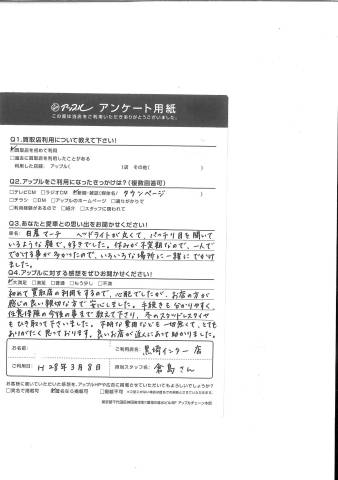 お車のご相談・ 査定だけでもOK! カンタン 入力 30秒 アップルがブランド買取始めました! お電話でも受付中! 受付時間10:00 ~ 18:30 0120-556-522 お車のご相談・ 査定だけでもOK! カンタン 入力 30秒 アップルがブランド買取始めました! お電話でも受付中! 受付時間10:00 ~ 18:30 0120-556-522 アップルがブランド買取始めました! お電話でも受付中! 受付時間10:00 ~ 18:30 0120-556-522 店舗情報 在庫車 スタッフ紹介 ブログ お客様の声 キャンペーン お得 無料査定 click お客様の声 ご記入日: 2016/04/16 M様 初めて買取店を利用するので、心配でしたが、お店の方が感じの良い親切な方で安心しました。手続きも分かりやすく任意保険の今後のことまで教えて下さり、冬のスタッドレスタイヤも引き取ってくださいました。不明な費用も一切無くて、とてもありがたく思っております。良いお店が近くにあって助かりました。 前へ 次へ お客様の声一覧を見る