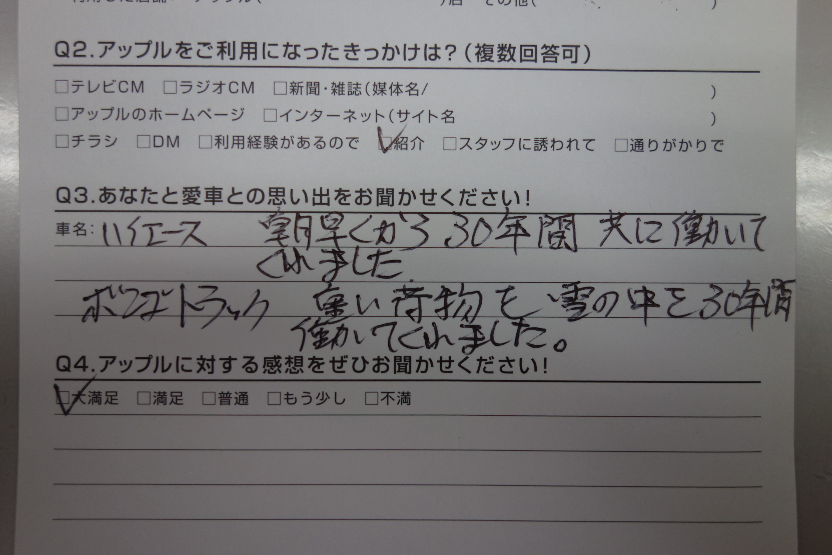 お車のご相談・ 査定だけでもOK! カンタン 入力 30秒 アップルがブランド買取始めました! お電話でも受付中! 受付時間10:00 ~ 19:00 0265-52-4040 お車のご相談・ 査定だけでもOK! カンタン 入力 30秒 アップルがブランド買取始めました! お電話でも受付中! 受付時間10:00 ~ 19:00 0265-52-4040 アップルがブランド買取始めました! お電話でも受付中! 受付時間10:00 ~ 19:00 0265-52-4040 店舗情報 在庫車 スタッフ紹介 ブログ お客様の声 キャンペーン 無料査定 click お客様の声 ご記入日: 2019/09/05 長野県飯田市 匿名希望K様 車名:マツダ ボンゴトラック 重い荷物を雪の中を30年間働いてくれました。 前へ 次へ お客様の声一覧を見る