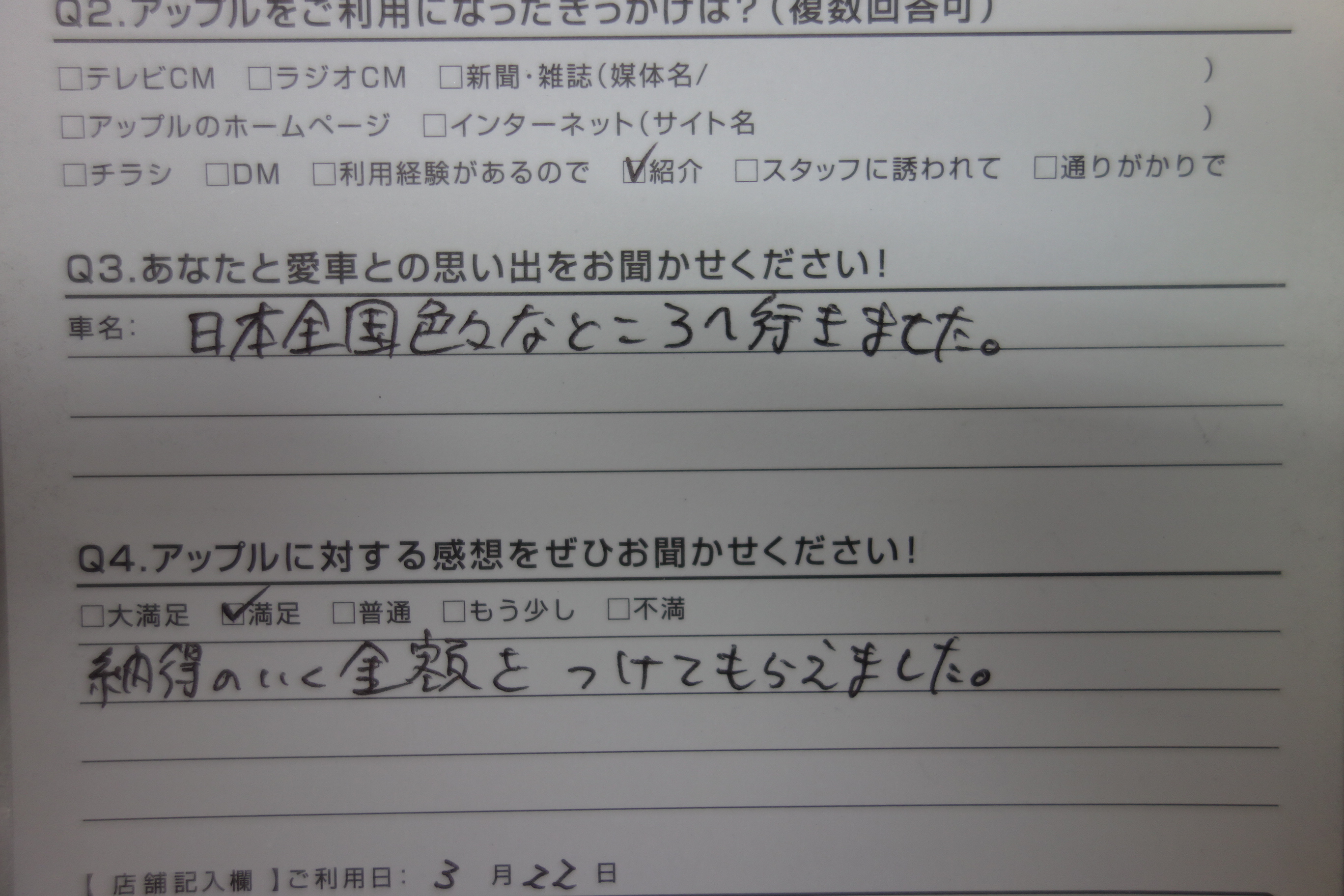 お車のご相談・ 査定だけでもOK! カンタン 入力 30秒 アップルがブランド買取始めました! お電話でも受付中! 受付時間10:00 ~ 19:00 0265-52-4040 お車のご相談・ 査定だけでもOK! カンタン 入力 30秒 アップルがブランド買取始めました! お電話でも受付中! 受付時間10:00 ~ 19:00 0265-52-4040 アップルがブランド買取始めました! お電話でも受付中! 受付時間10:00 ~ 19:00 0265-52-4040 店舗情報 在庫車 スタッフ紹介 ブログ お客様の声 キャンペーン 無料査定 click お客様の声 ご記入日: 2017/03/22 売木村 匿名希望I様 車名:トヨタ アクア 日本全国色々なところへ行きました。納得のいく金額をつけてもらえました。 前へ 次へ お客様の声一覧を見る