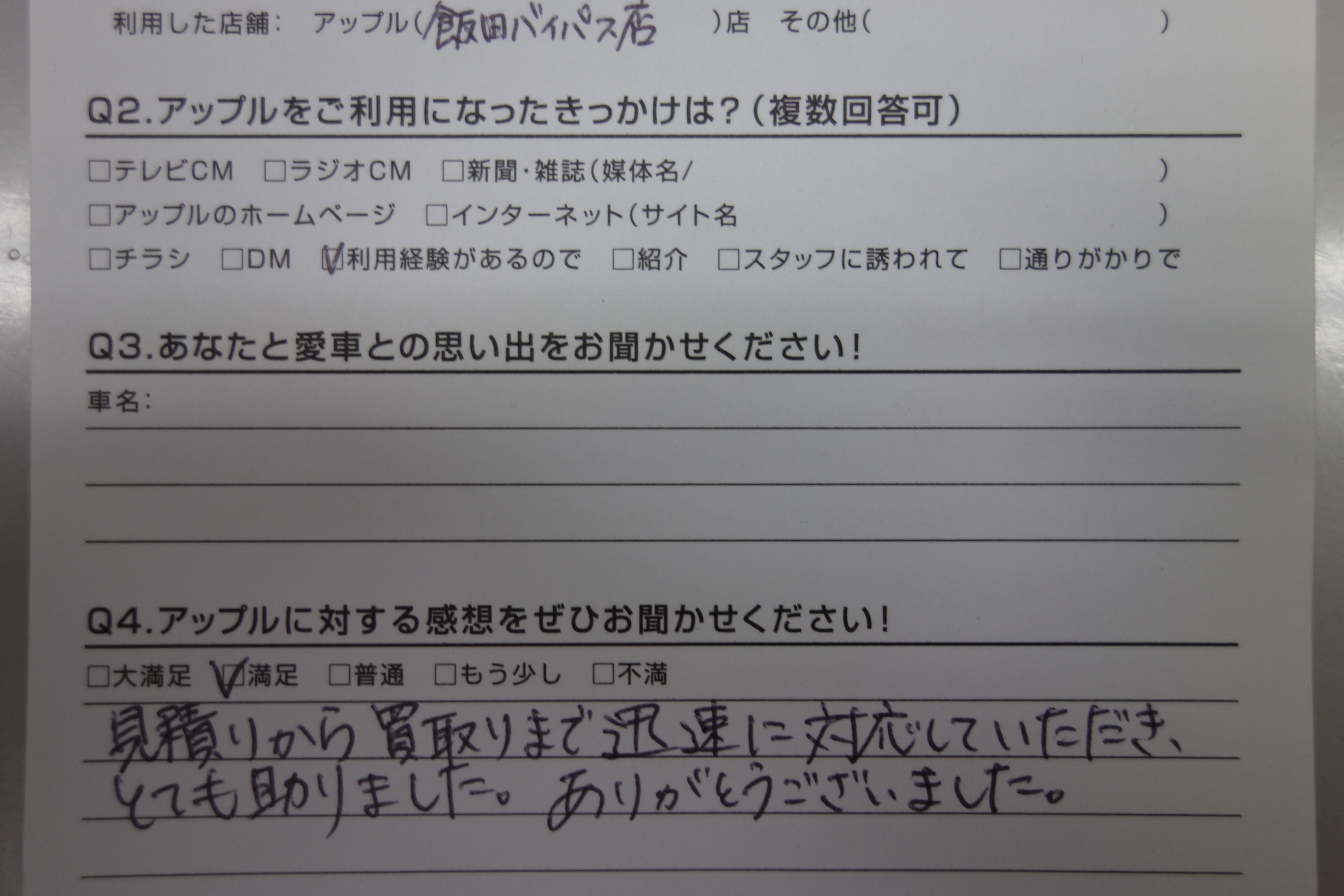 お車のご相談・ 査定だけでもOK! カンタン 入力 30秒 アップルがブランド買取始めました! お電話でも受付中! 受付時間10:00 ~ 19:00 0265-52-4040 お車のご相談・ 査定だけでもOK! カンタン 入力 30秒 アップルがブランド買取始めました! お電話でも受付中! 受付時間10:00 ~ 19:00 0265-52-4040 アップルがブランド買取始めました! お電話でも受付中! 受付時間10:00 ~ 19:00 0265-52-4040 店舗情報 在庫車 スタッフ紹介 ブログ お客様の声 キャンペーン 無料査定 click お客様の声 ご記入日: 2018/07/12 長野県阿南町 匿名希望D様 車名:スズキ キャリイ 見積もりから買取まで迅速に対応していただき、とても助かりました。ありがとうございました。 前へ 次へ お客様の声一覧を見る