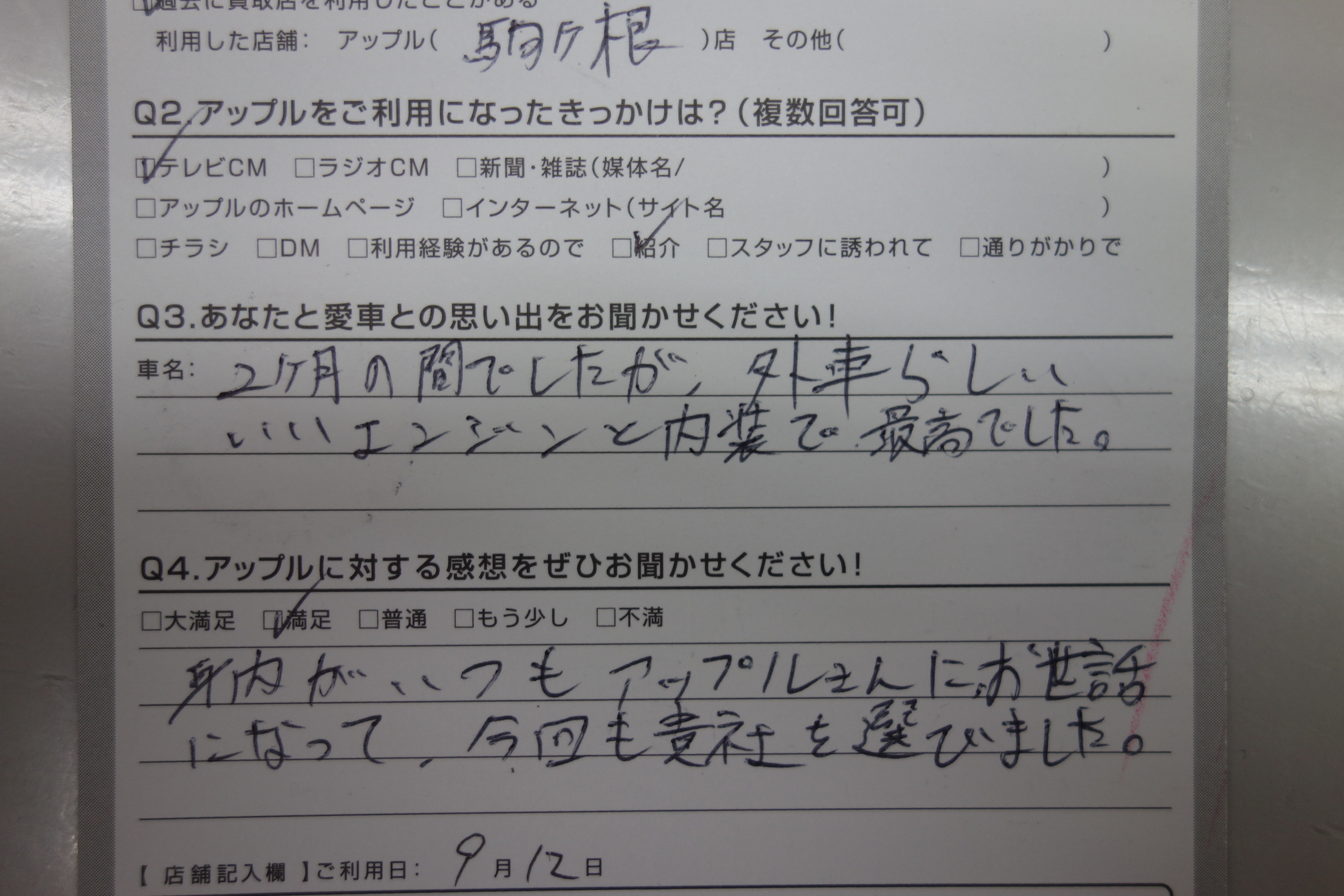 お車のご相談・ 査定だけでもOK! カンタン 入力 30秒 アップルがブランド買取始めました! お電話でも受付中! 受付時間10:00 ~ 19:00 0265-52-4040 お車のご相談・ 査定だけでもOK! カンタン 入力 30秒 アップルがブランド買取始めました! お電話でも受付中! 受付時間10:00 ~ 19:00 0265-52-4040 アップルがブランド買取始めました! お電話でも受付中! 受付時間10:00 ~ 19:00 0265-52-4040 店舗情報 在庫車 スタッフ紹介 ブログ お客様の声 キャンペーン 無料査定 click お客様の声 ご記入日: 2019/09/12 長野県駒ケ根市 匿名希望Y様 車名:アウディ A1 2ヶ月の間でしたが、外車らしいいいエンジンと内装で最高でした。身内がいつもアップルさんにお世話になって、今回も貴社を選びました。 前へ 次へ お客様の声一覧を見る