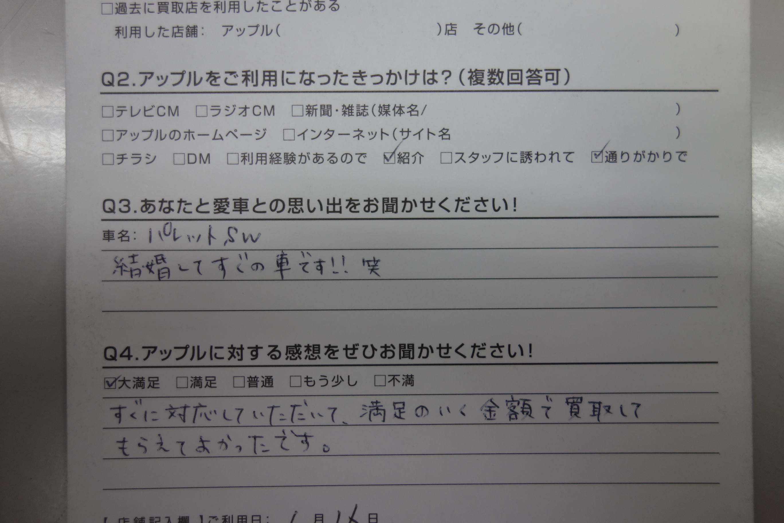 お車のご相談・ 査定だけでもOK! カンタン 入力 30秒 アップルがブランド買取始めました! お電話でも受付中! 受付時間10:00 ~ 19:00 0265-52-4040 お車のご相談・ 査定だけでもOK! カンタン 入力 30秒 アップルがブランド買取始めました! お電話でも受付中! 受付時間10:00 ~ 19:00 0265-52-4040 アップルがブランド買取始めました! お電話でも受付中! 受付時間10:00 ~ 19:00 0265-52-4040 店舗情報 在庫車 スタッフ紹介 ブログ お客様の声 キャンペーン 無料査定 click お客様の声 ご記入日: 2017/01/16 長野県喬木村 匿名希望S様 車名:スズキ パレット 結婚してすぐの車です!!笑すぐに対応していただいて、満足のいく金額で買取してもらえてよかったです。 前へ 次へ お客様の声一覧を見る