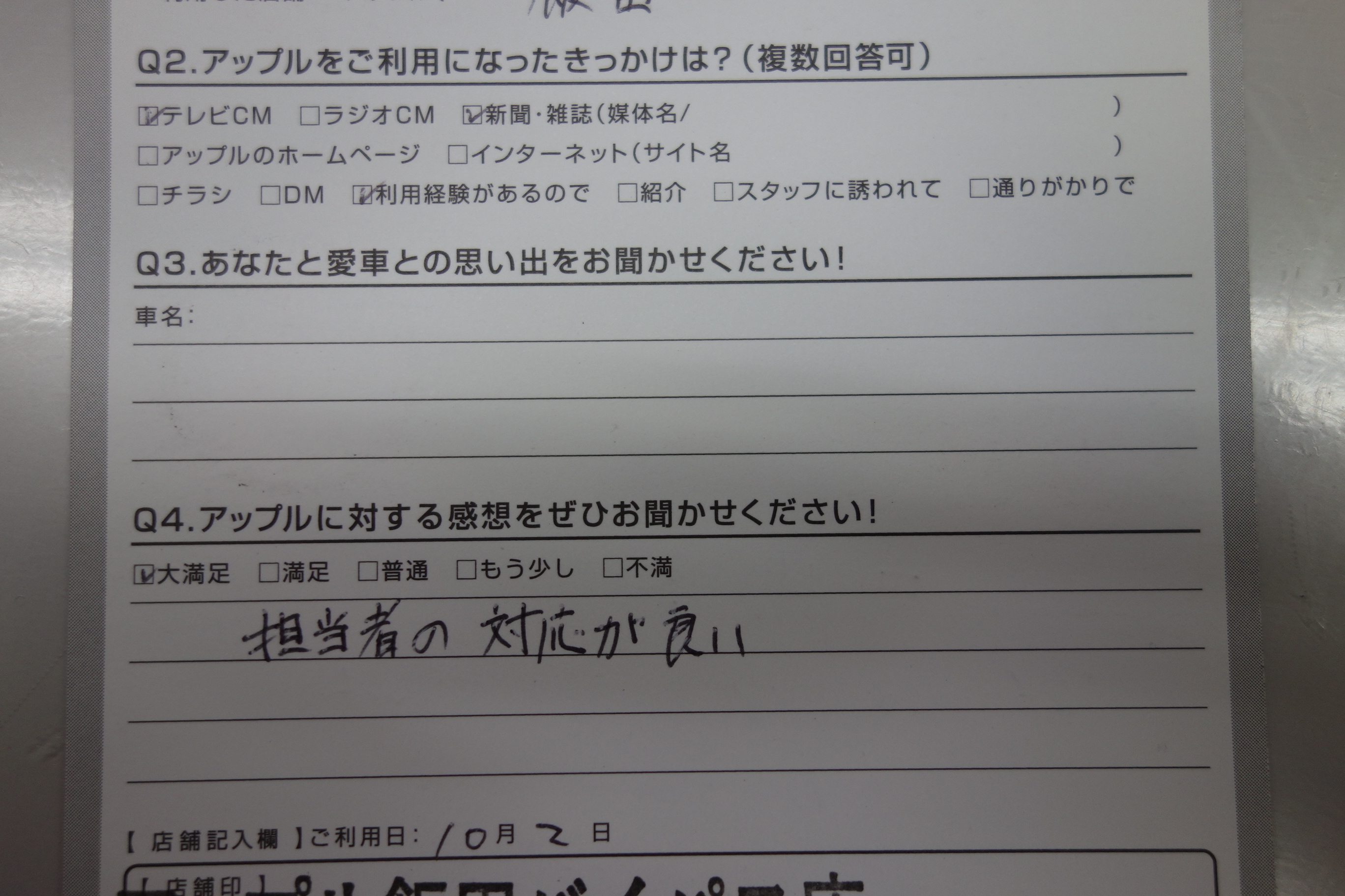 お車のご相談・ 査定だけでもOK! カンタン 入力 30秒 アップルがブランド買取始めました! お電話でも受付中! 受付時間10:00 ~ 19:00 0265-52-4040 お車のご相談・ 査定だけでもOK! カンタン 入力 30秒 アップルがブランド買取始めました! お電話でも受付中! 受付時間10:00 ~ 19:00 0265-52-4040 アップルがブランド買取始めました! お電話でも受付中! 受付時間10:00 ~ 19:00 0265-52-4040 店舗情報 在庫車 スタッフ紹介 ブログ お客様の声 キャンペーン 無料査定 click お客様の声 ご記入日: 2016/10/02 長野県飯田市 匿名希望N様 車名:ホンダ フィット(H25年9月以降のハイブリッド含む) 担当者の対応が良い 前へ 次へ お客様の声一覧を見る
