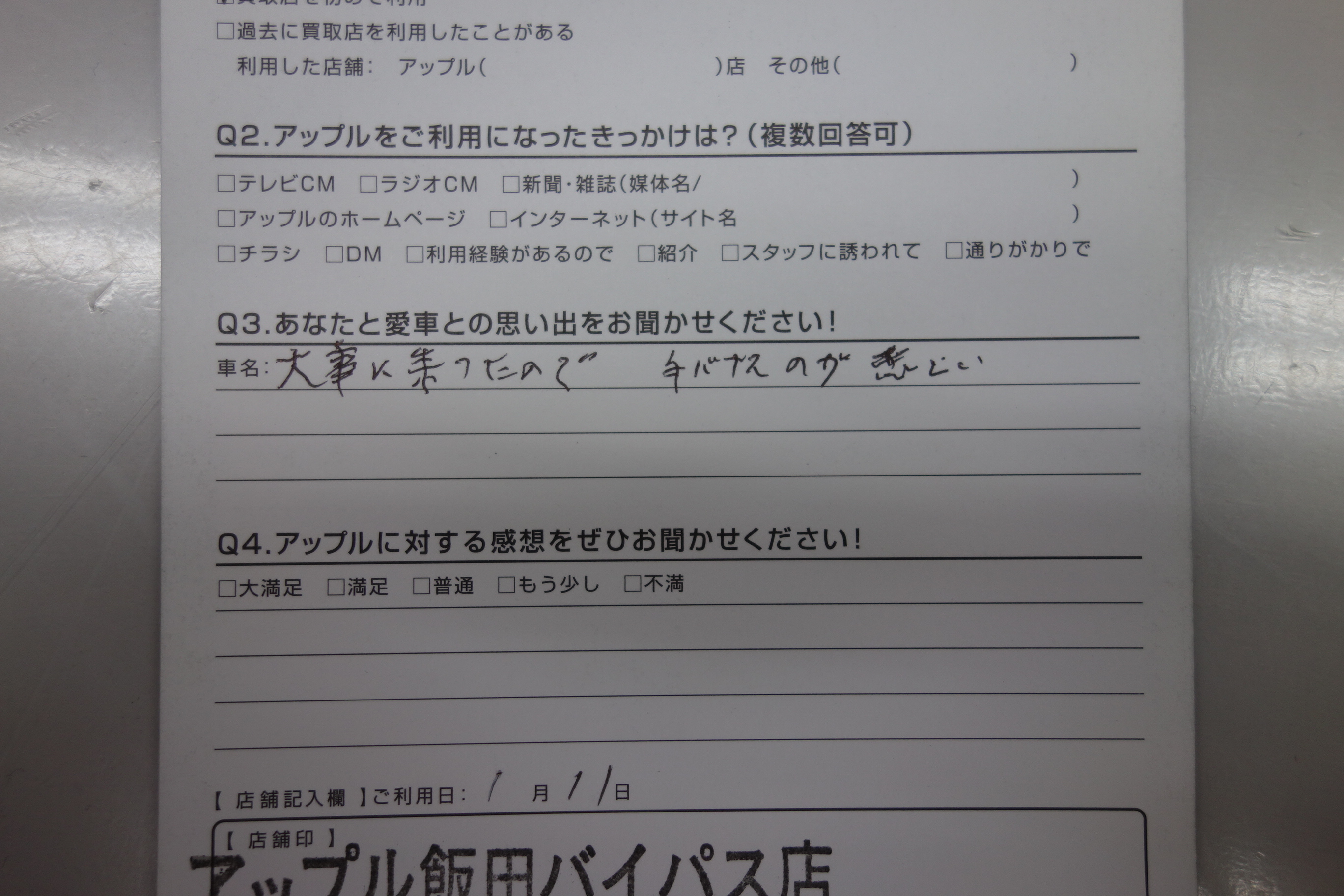 お車のご相談・ 査定だけでもOK! カンタン 入力 30秒 アップルがブランド買取始めました! お電話でも受付中! 受付時間10:00 ~ 19:00 0265-52-4040 お車のご相談・ 査定だけでもOK! カンタン 入力 30秒 アップルがブランド買取始めました! お電話でも受付中! 受付時間10:00 ~ 19:00 0265-52-4040 アップルがブランド買取始めました! お電話でも受付中! 受付時間10:00 ~ 19:00 0265-52-4040 店舗情報 在庫車 スタッフ紹介 ブログ お客様の声 キャンペーン 無料査定 click お客様の声 ご記入日: 2017/01/11 長野県飯田市 匿名希望H様 車名:国産車その他 その他 大事に乗ったので、手放すのが悲しい。 前へ 次へ お客様の声一覧を見る